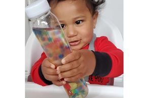 A sensory bottle is a colorful and calming activity for young children. Fill a clear plastic bottle with objects like glitter, bouncy balls, or dry food (corn or rice). Next, add water to make the objects float. Encourage your child to move the bottle and share his or her observations. You will be amazed by how entertaining this activity can be!
